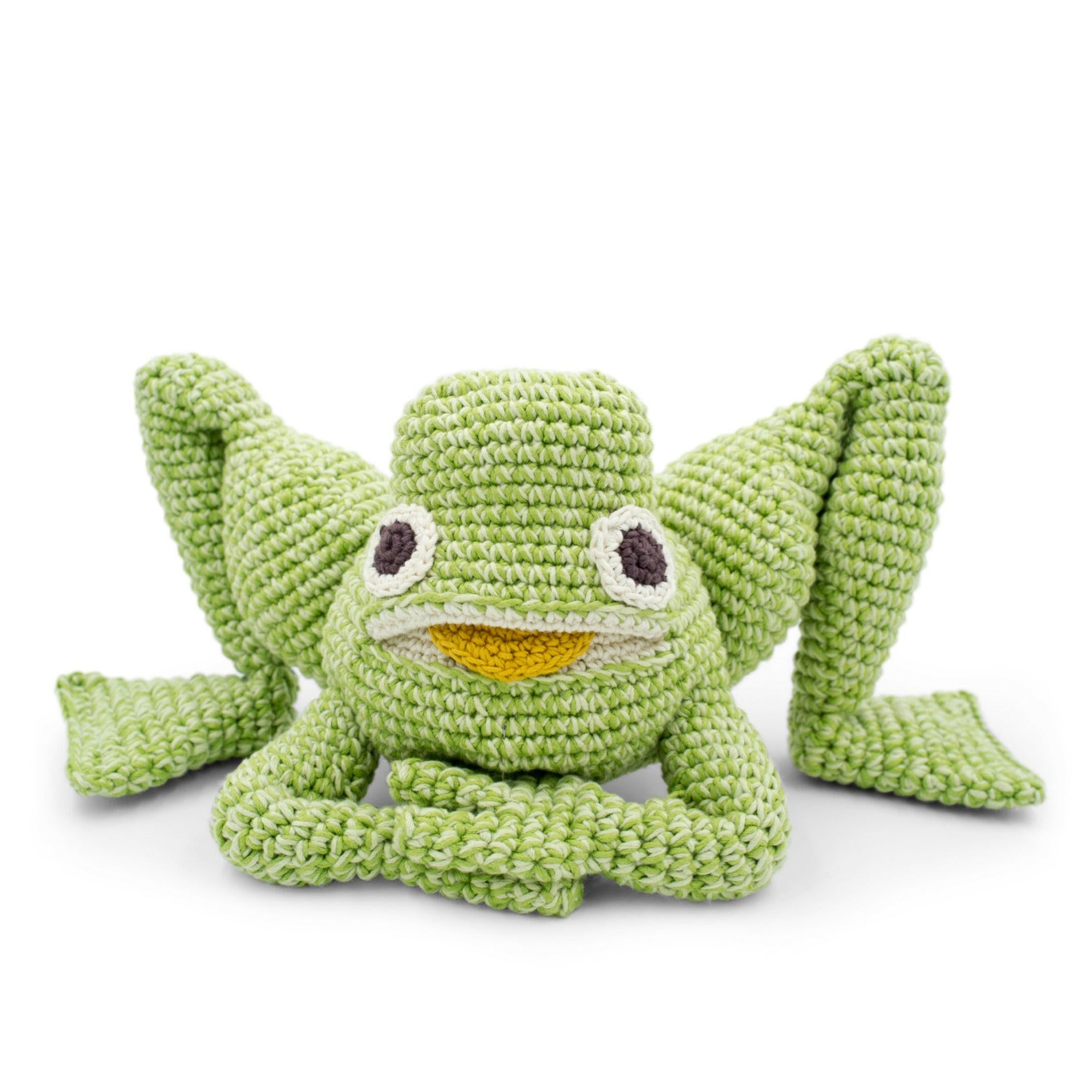 Ce jouet en forme de grenouille est une idée de cadeau de naissance originale et écologique. Conçu à partir de techniques artisanales traditionnelles, cette grenouille en crochet est un compagnon ludique et durable pour les bébés.